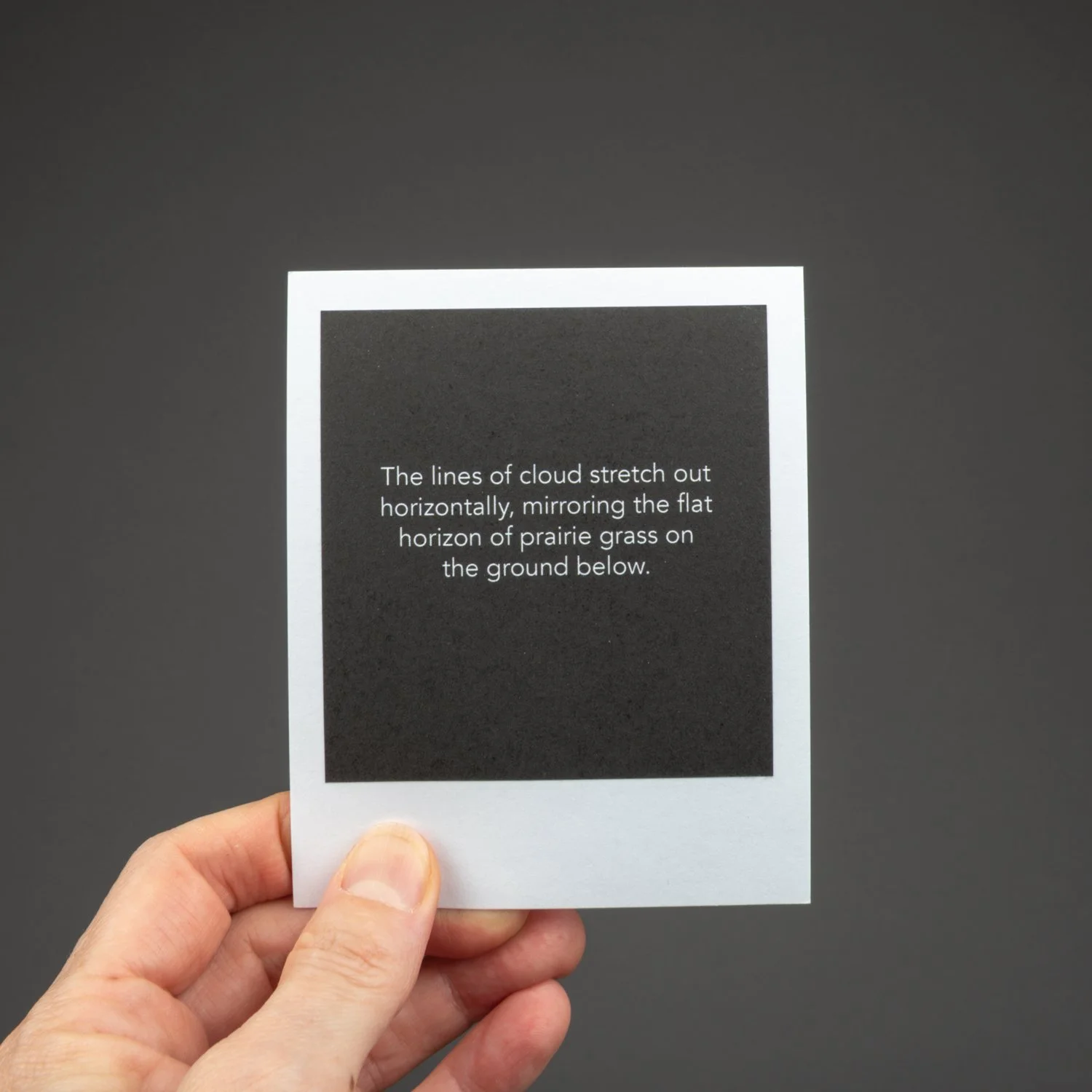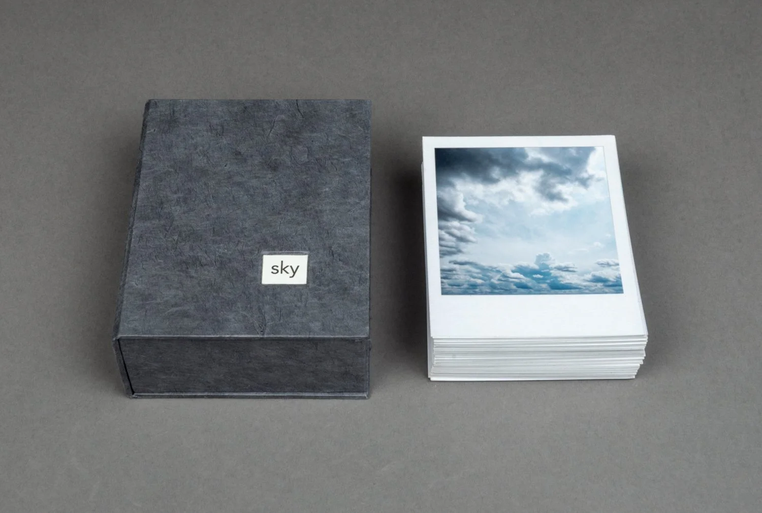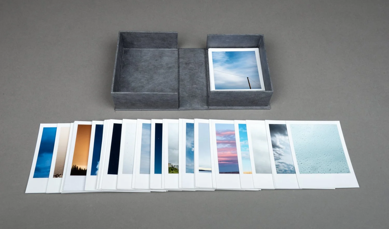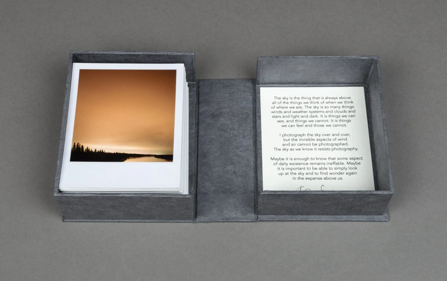 This unbound book is a box of sky: sky in all seasons, weather conditions, and times of day. It’s the sky of Alberta, but it could be many places. There are ____ images. They look like polaroids, but aren’t. But they look like it because I wanted each image to communicate the immediacy of a polaroid, and the uniqueness and tactile physicality of each image, one image shot at a specific moment in time that you can hold in your hands.