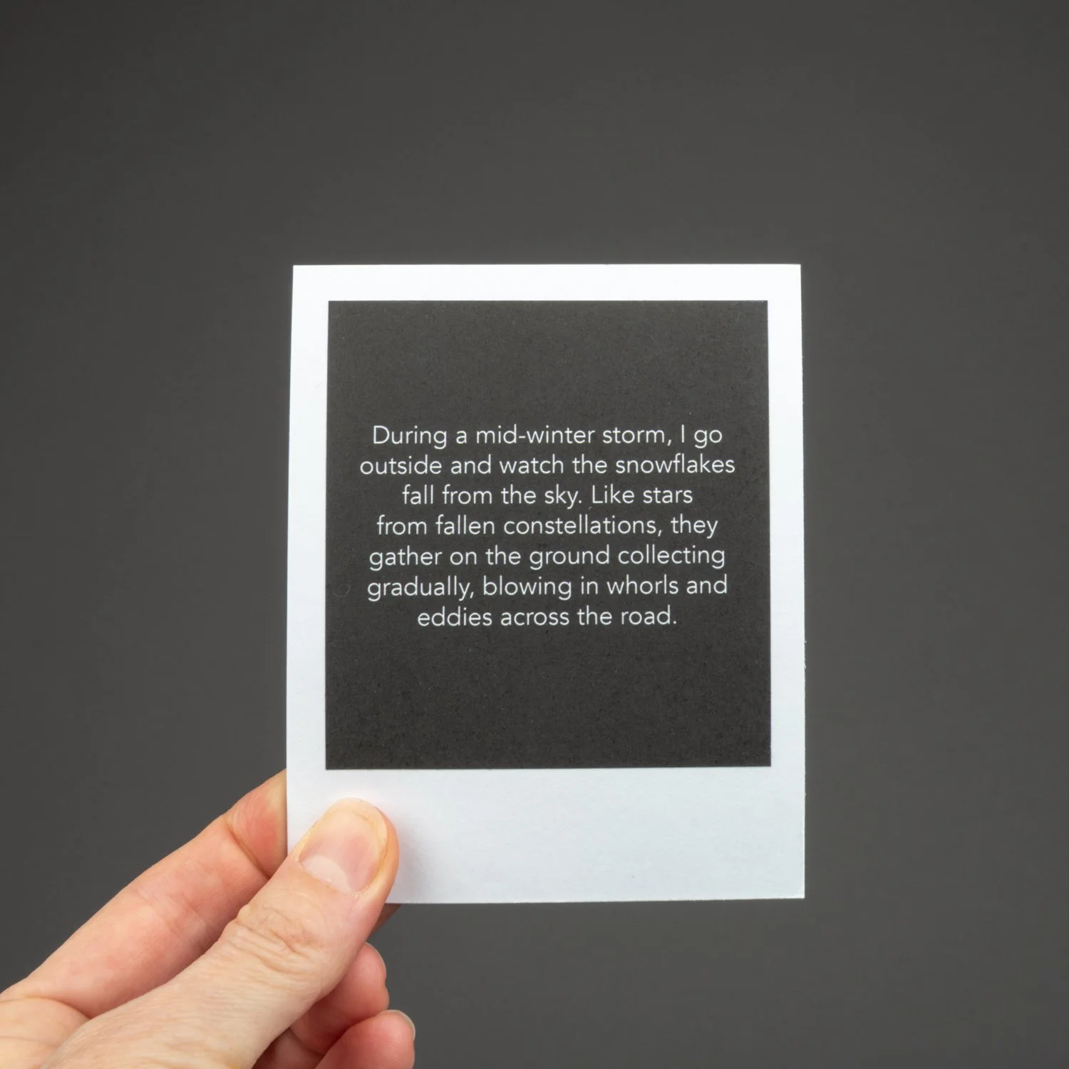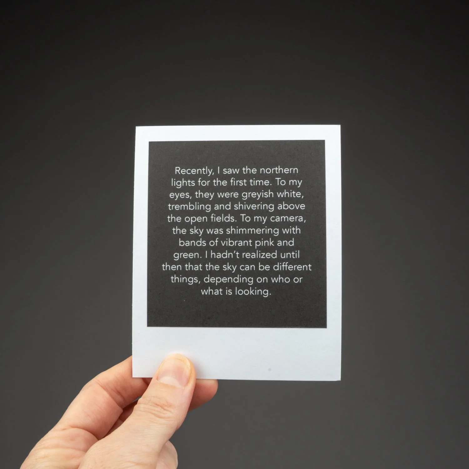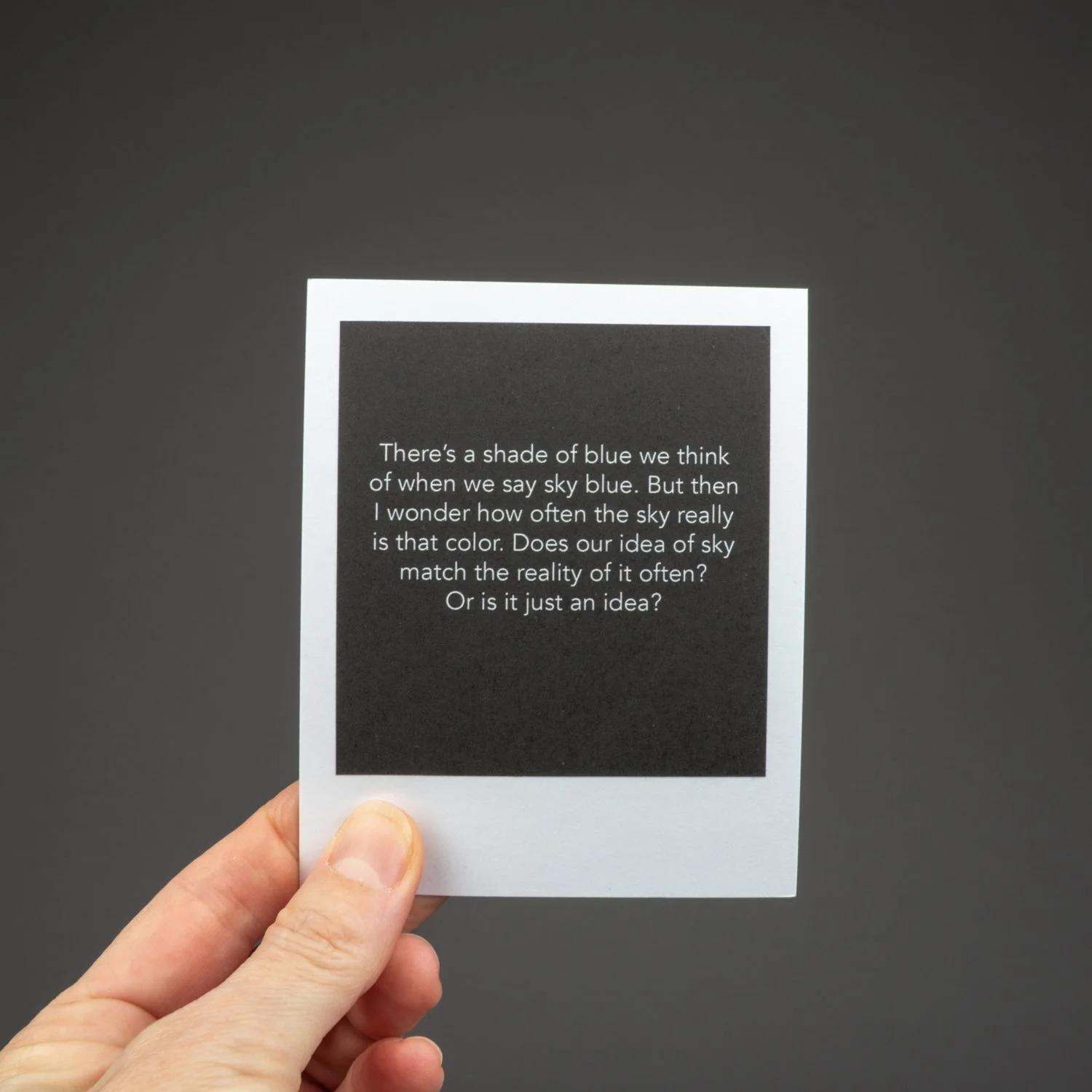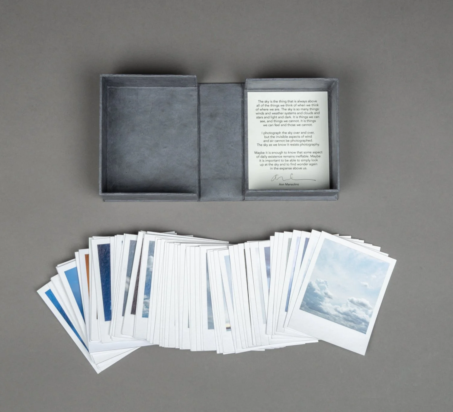 This unbound book is a box of sky: sky in all seasons, weather conditions, and times of day. It’s the sky of Alberta, but it could be many places. There are ____ images. They look like polaroids, but aren’t. But they look like it because I wanted each image to communicate the immediacy of a polaroid, and the uniqueness and tactile physicality of each image, one image shot at a specific moment in time that you can hold in your hands.
