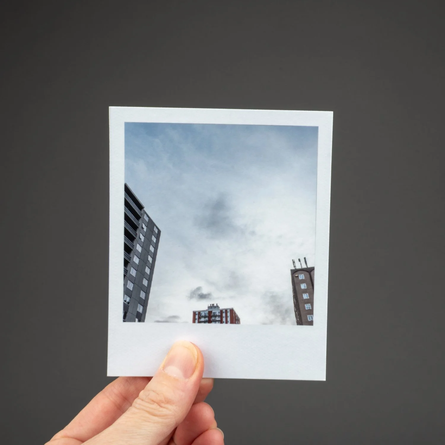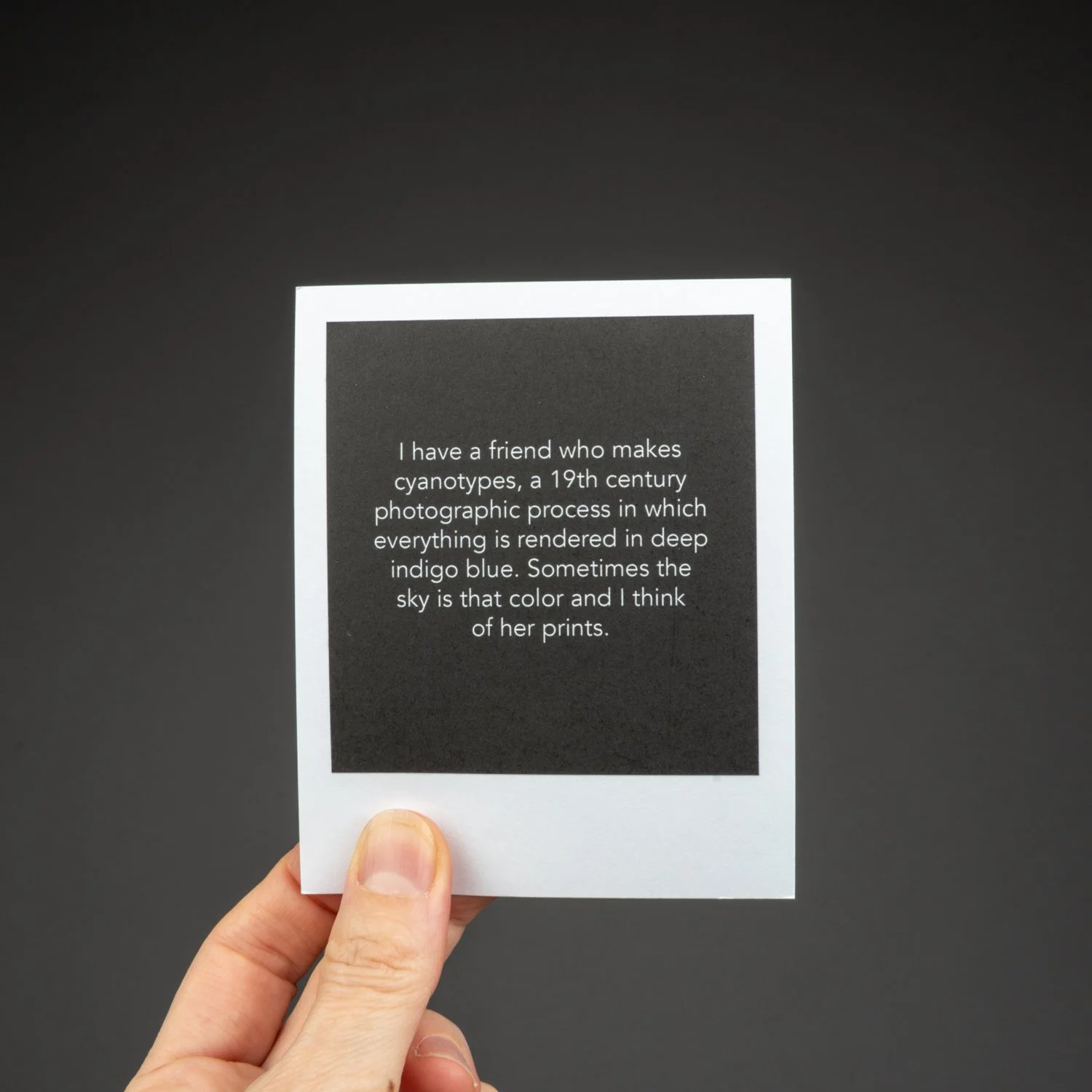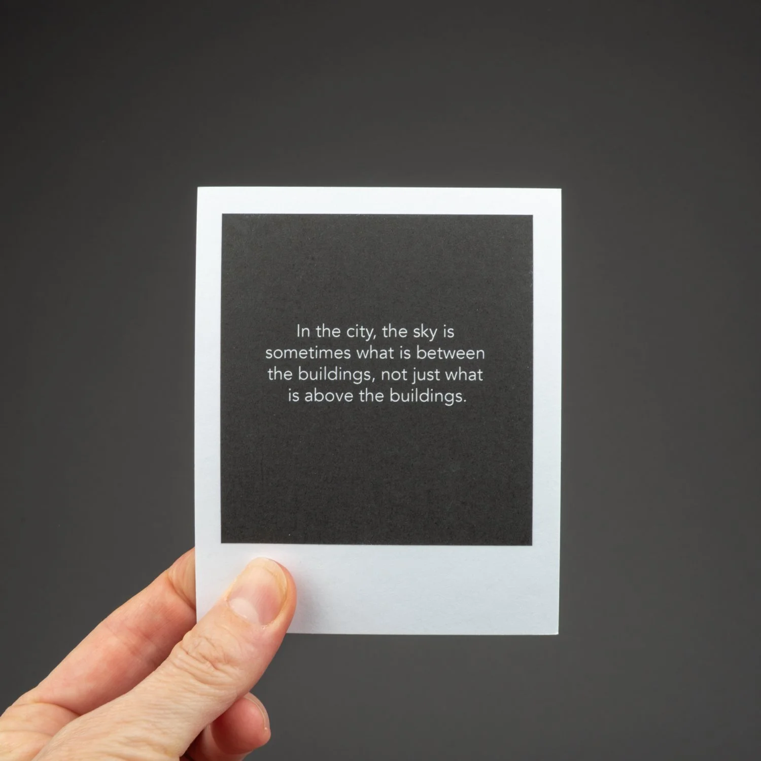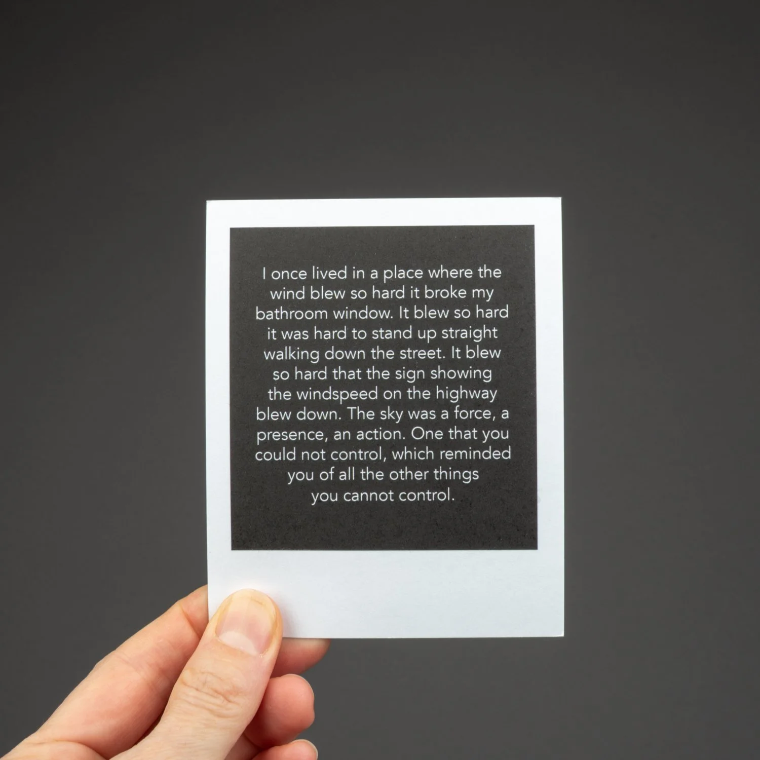 This unbound book is a box of sky: sky in all seasons, weather conditions, and times of day. It’s the sky of Alberta, but it could be many places. There are ____ images. They look like polaroids, but aren’t. But they look like it because I wanted each image to communicate the immediacy of a polaroid, and the uniqueness and tactile physicality of each image, one image shot at a specific moment in time that you can hold in your hands.